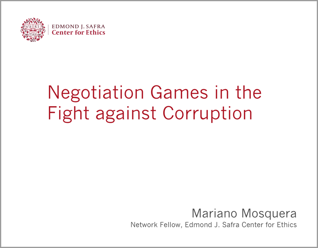 • Mosquera, Mariano. 2014. Negotiation Games in the Fight Against Corruption. Edmond J. Safra Center for Ethics at Harvard University Working Paper 46, 3-25.