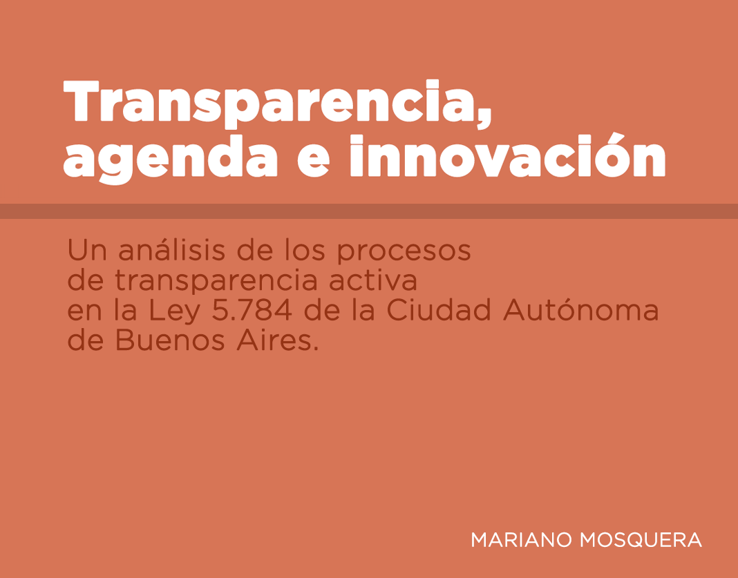 • Mosquera, Mariano. 2018. Transparencia, agenda e innovación. Un análisis de los procesos de transparencia activa en la Ley 5.784 de la Ciudad Autónoma de Buenos Aires. En Basterra, Marcela (Ed.), Ciudad transparente: Ley n° 104 comentada, Ley n° 5784 y decreto reglamentario n° 260/17 - Jurisprudencia y Doctrina, vol. 1, número 20 (pp. 359-389). Buenos Aires: Jusbaires Editorial.